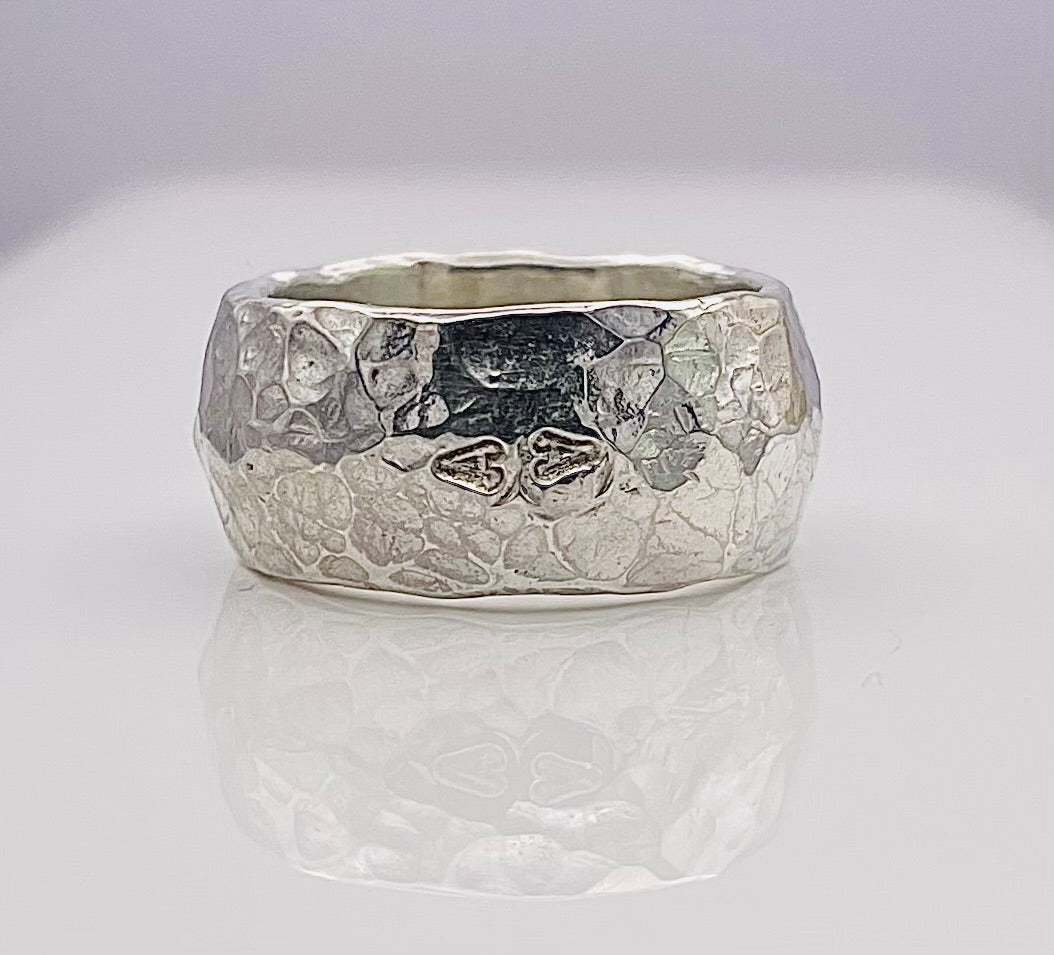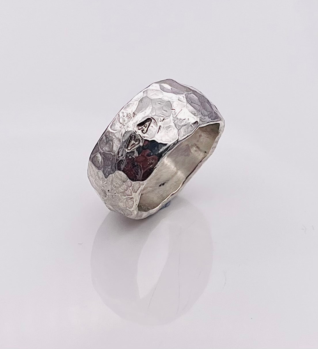 Rugged, strong look, created by beating the surface of the band with a heavy hammer, making every ring completely unique.