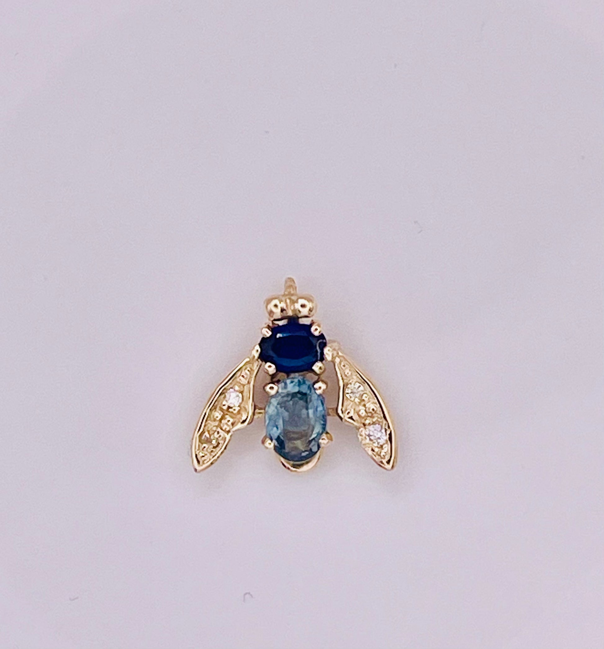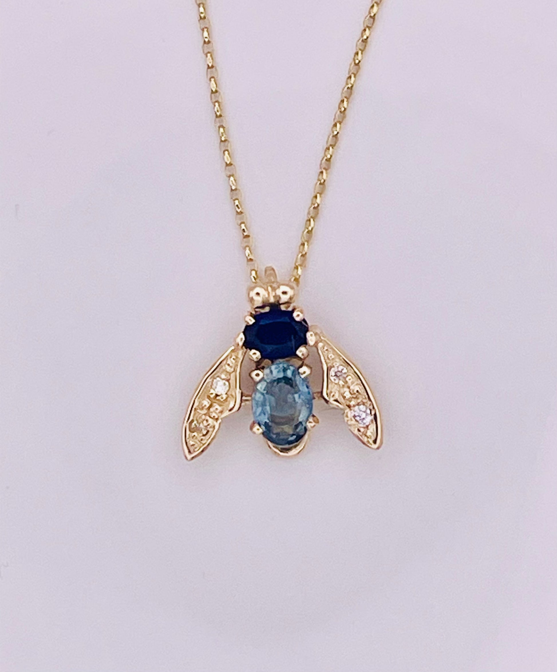 Hand made in 9 carat yellow gold set with 2 sapphires with the wings finished with preloved, recycled diamonds. The Blue Bee pendant comes on a pretty 9 carat yellow gold chain, approximately 18” long