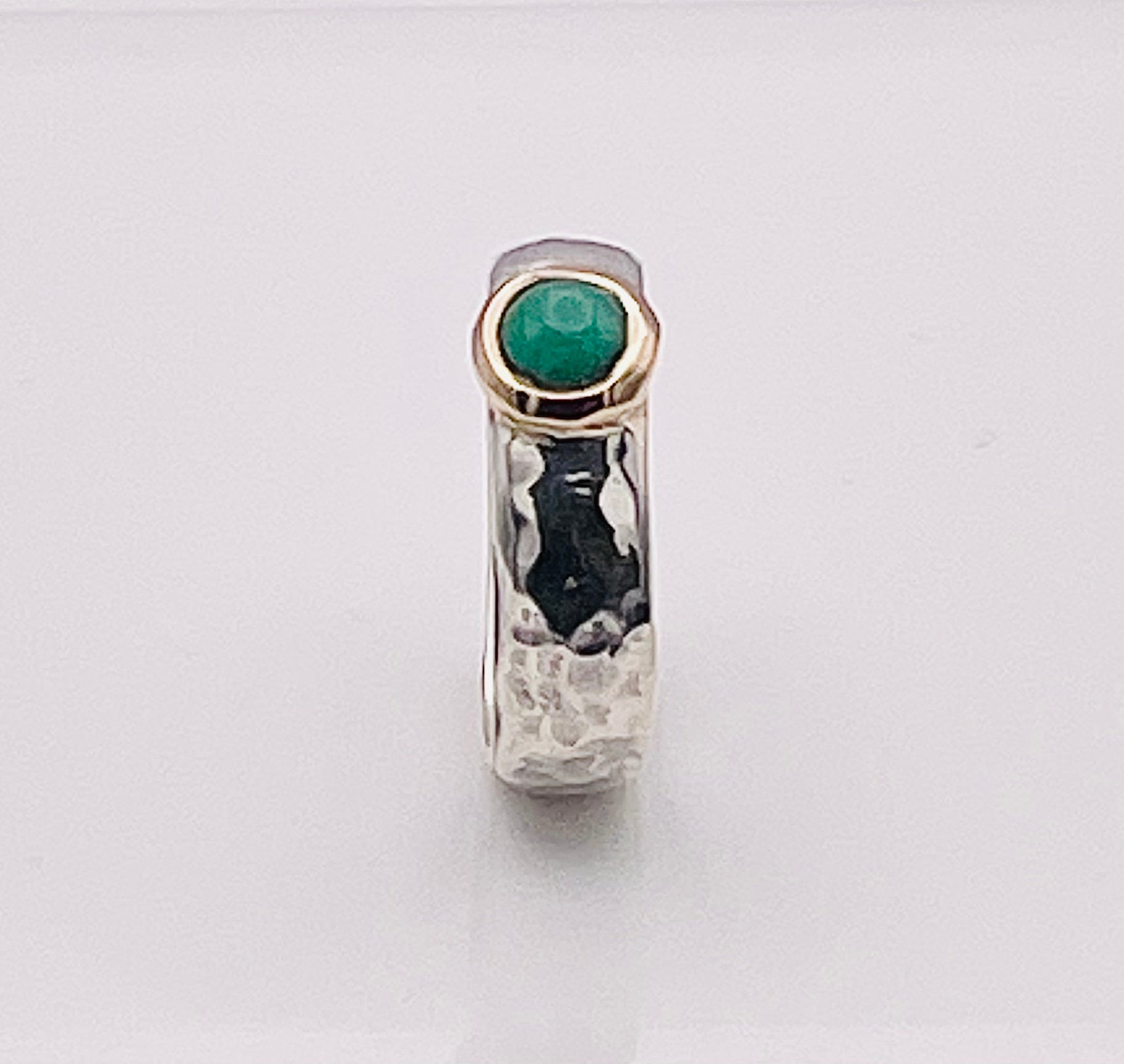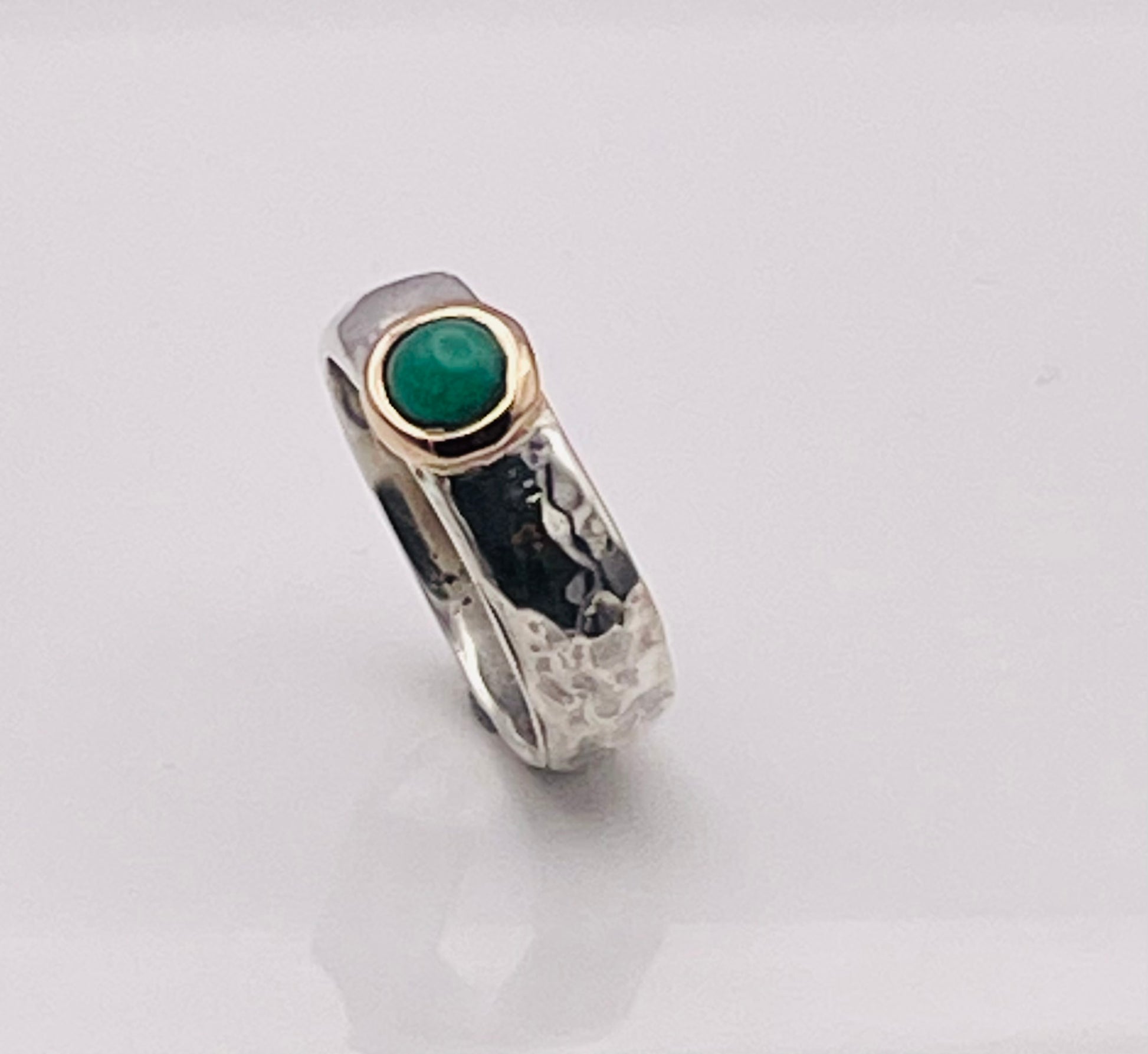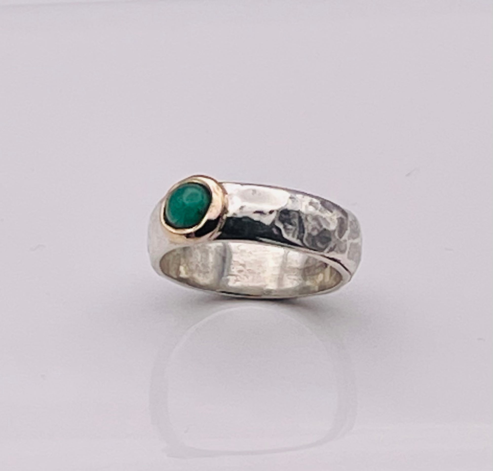 From the brand new collection ‘Angels and Anvils’ I love this combination, the contrast between gold, silver and cabochon emerald is so striking. Each of the rings in this collection will be completely individual, the band is struck time and time again to give this dramatic, planished finish.