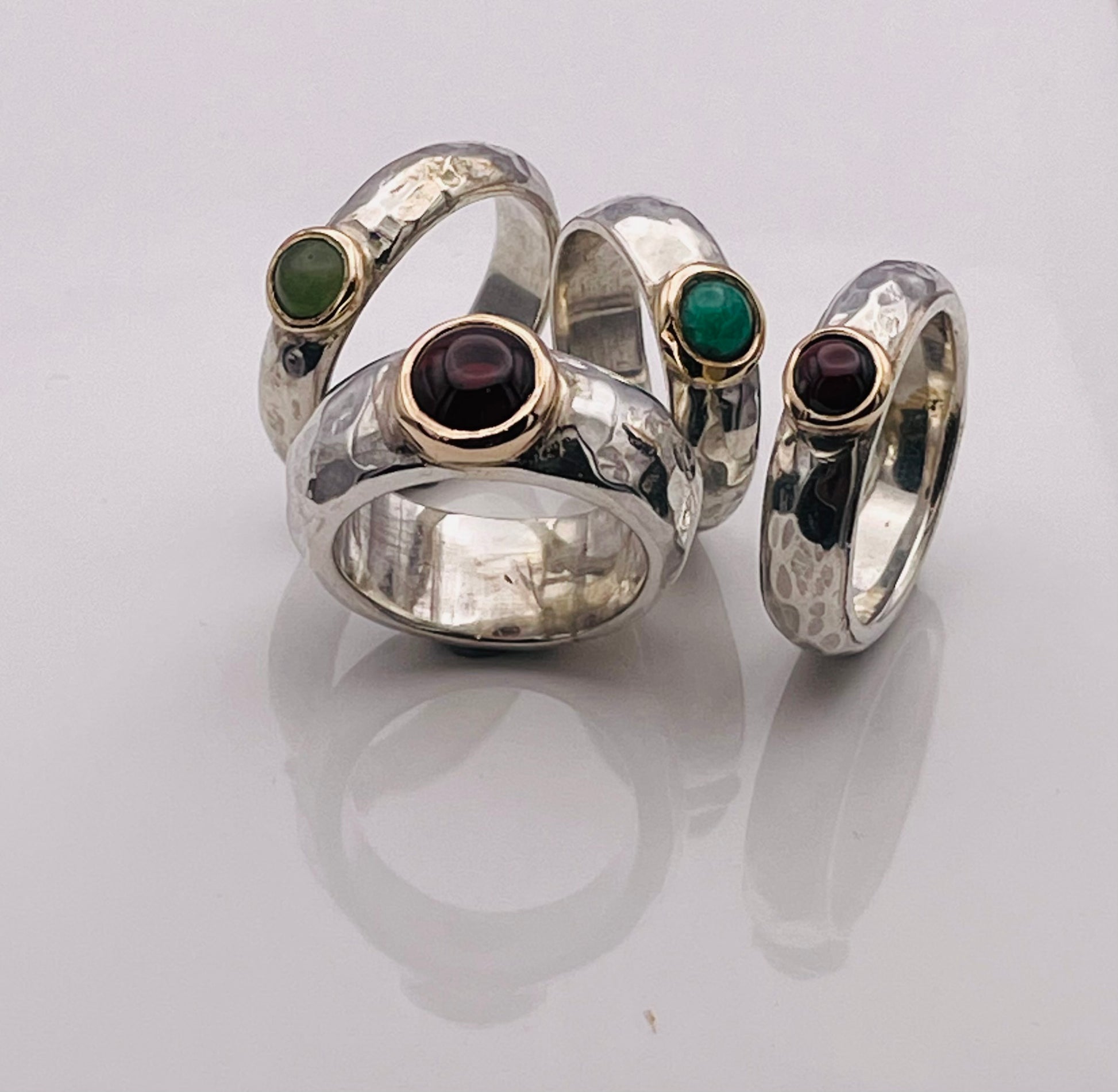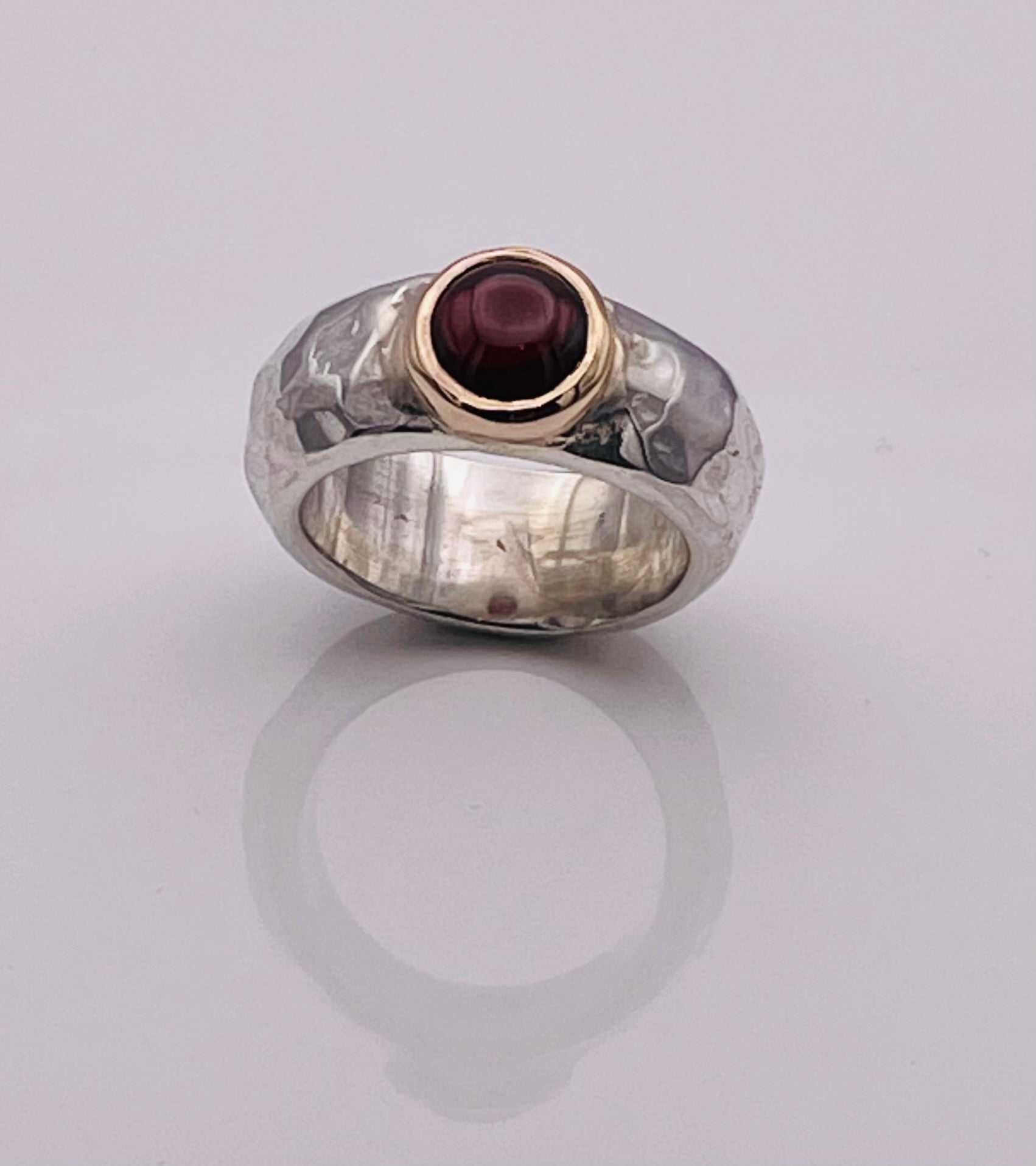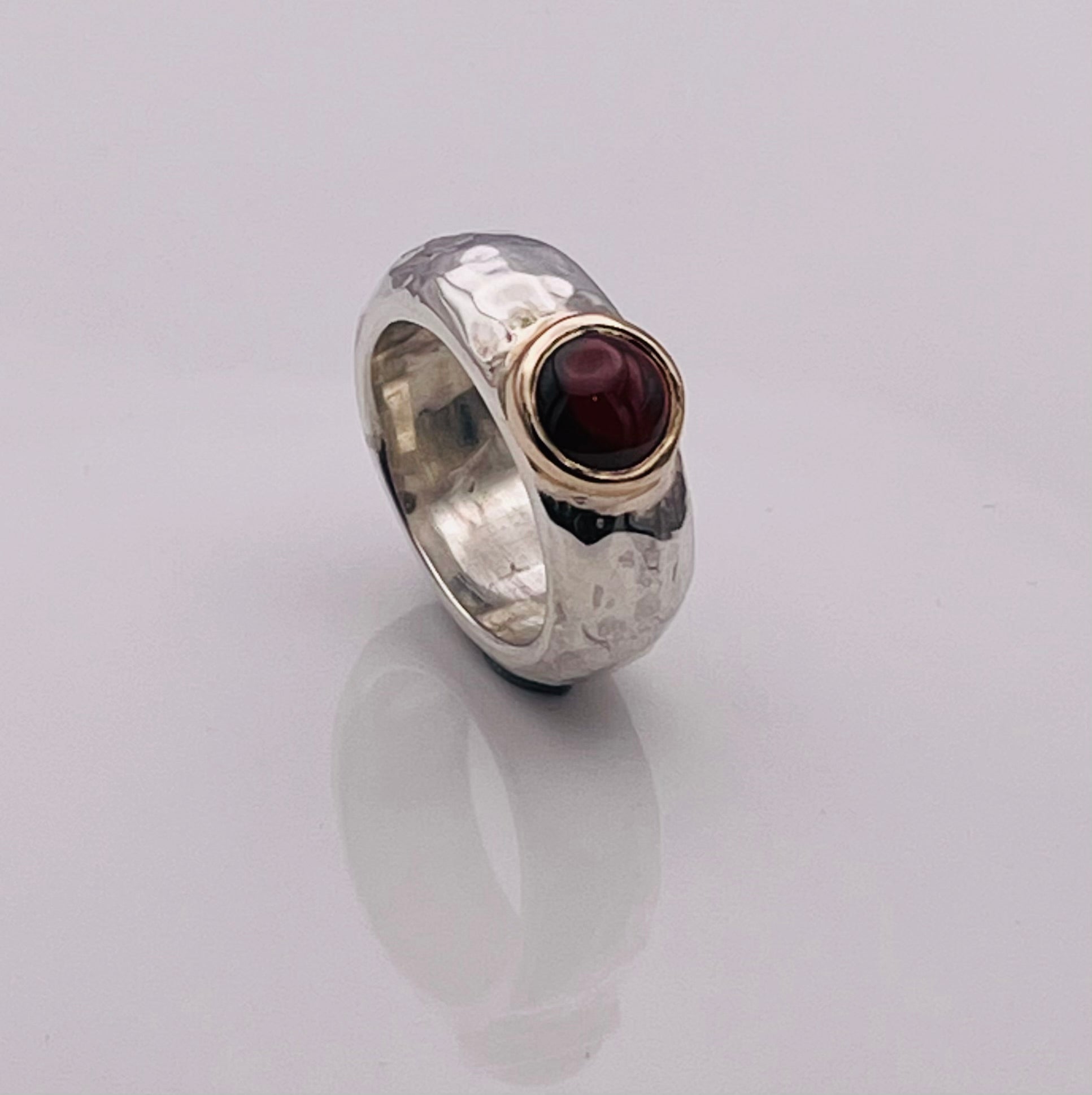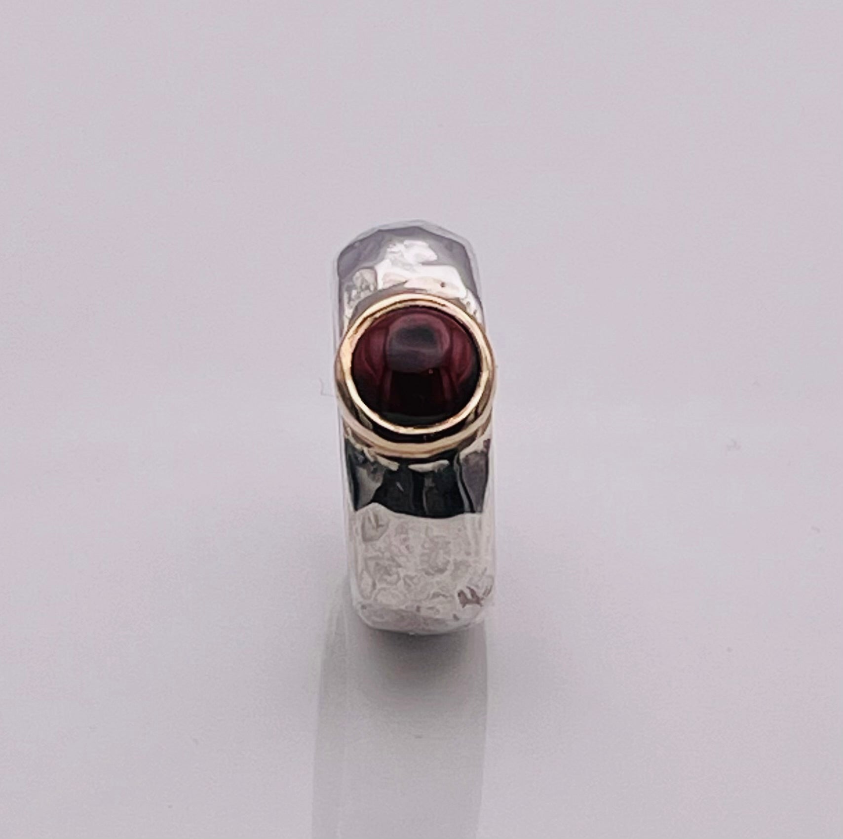 8mm cabochon garnet set into chunky 8mm sterling silver ring with 9 carat yellow gold hammered setting.