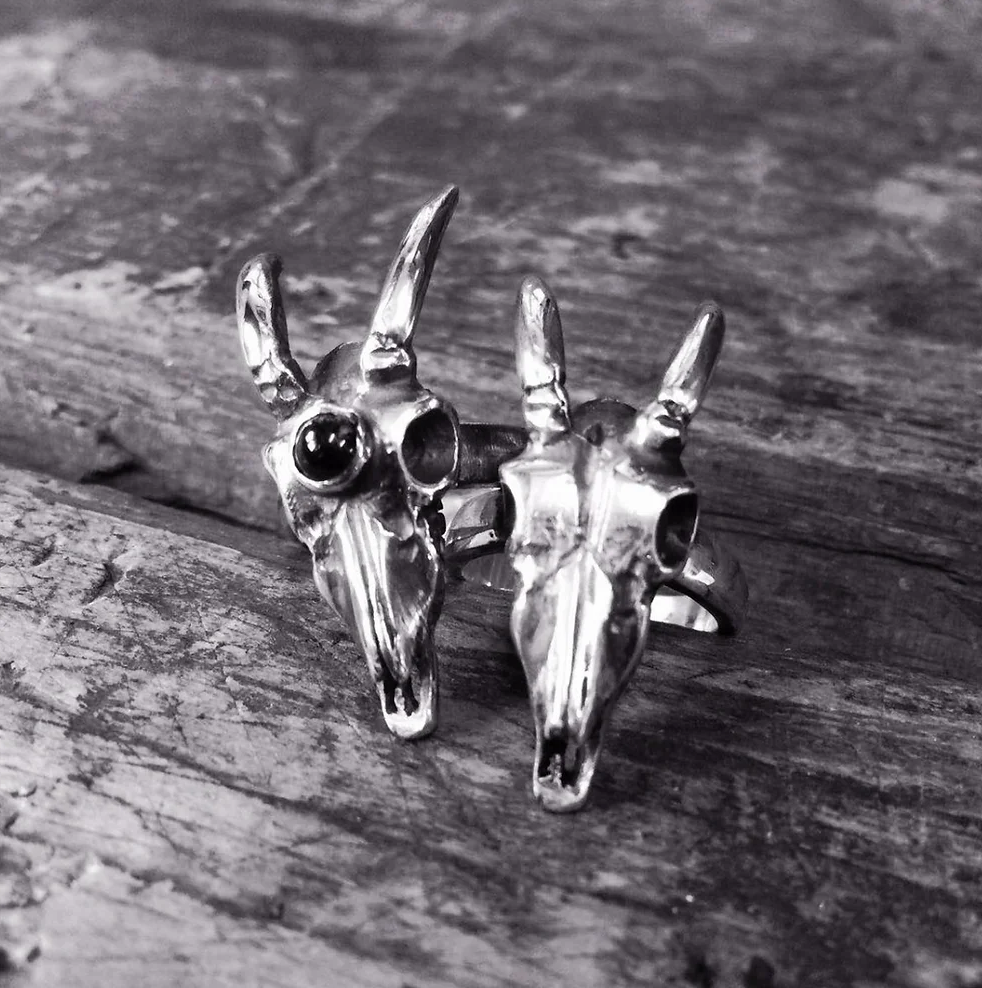 This solid silver ring is hand carved to depict the skull of a deer, with a round garnet stone in the centre of the skull. Measurement from top of the horns to the bottom of the jaw: 3.5 cm Carved in solid silver