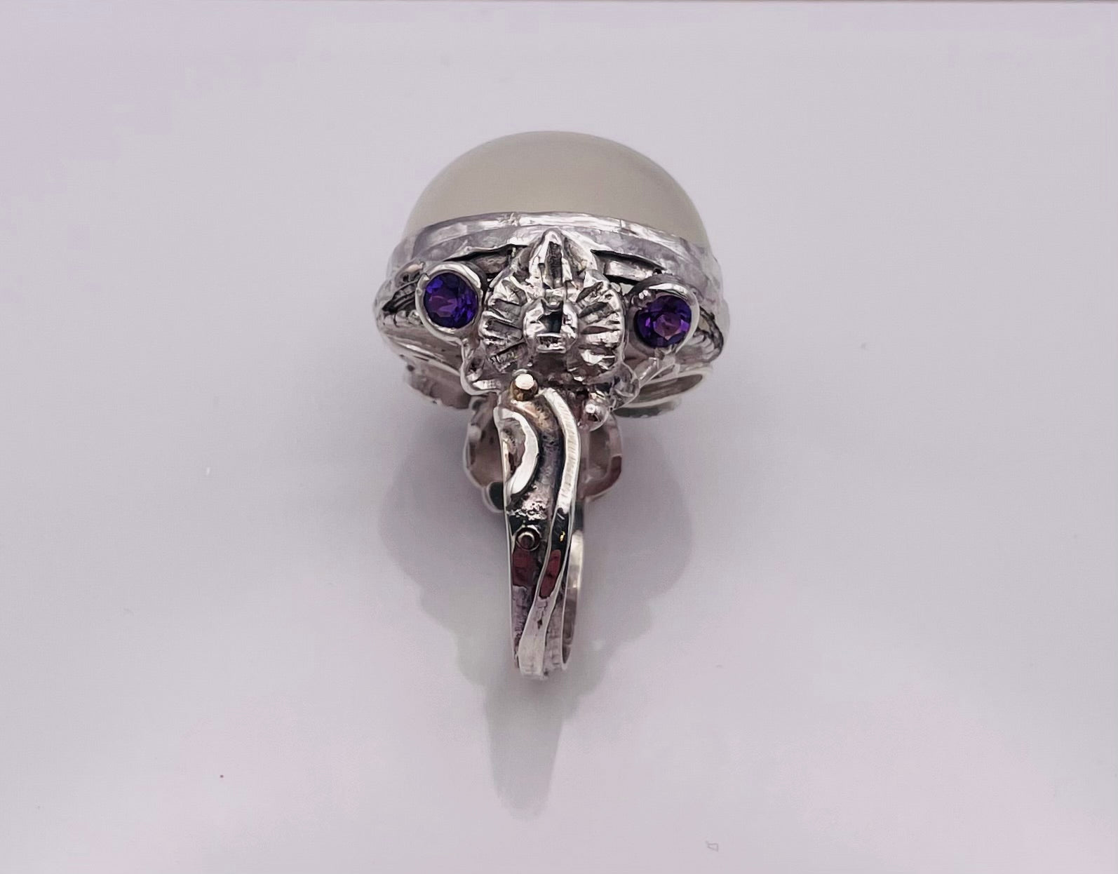 4 x 3.5 mm round striking amethysts light up the underside of the ring which is finished with 2 , hand carved orchids.
