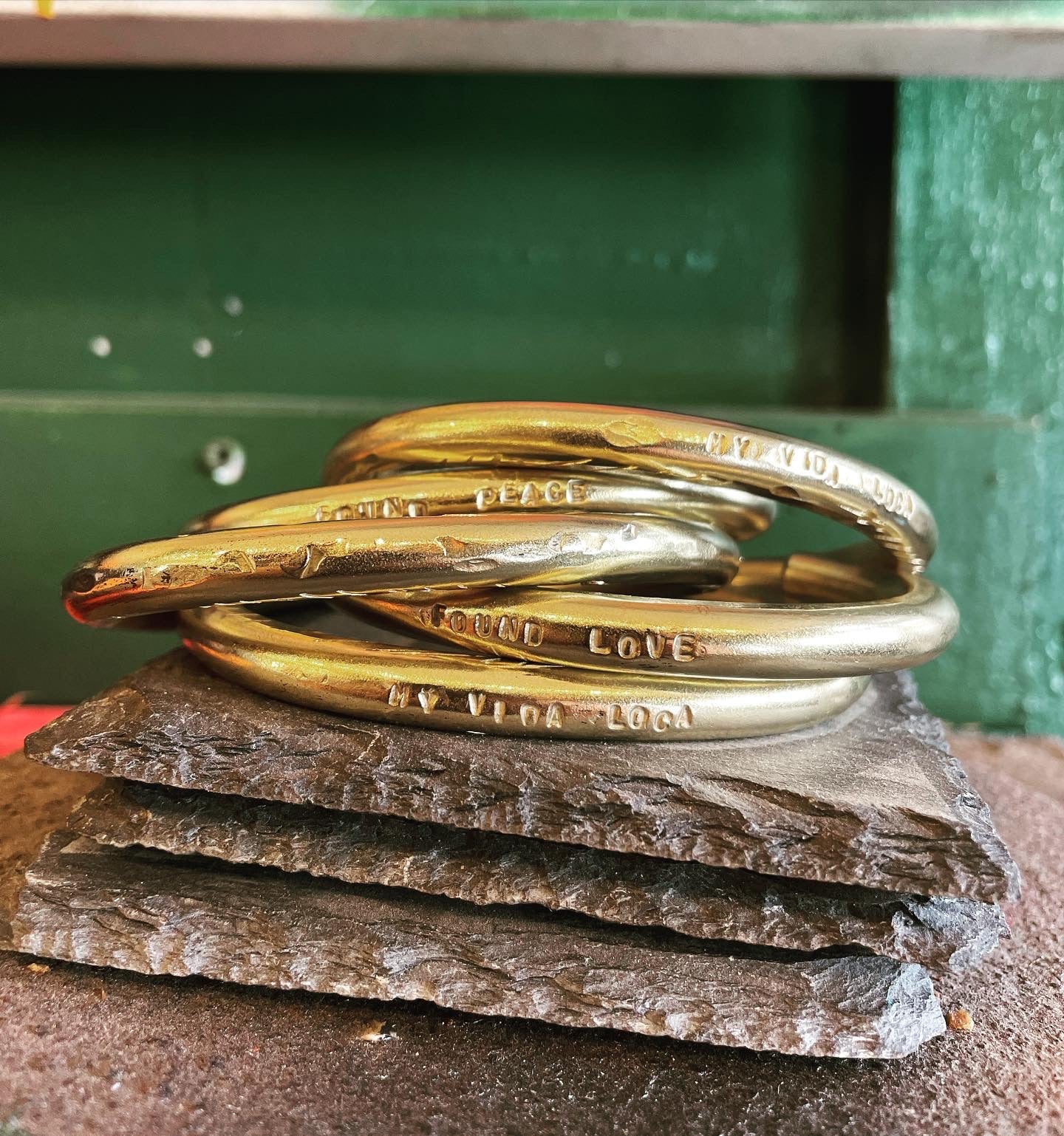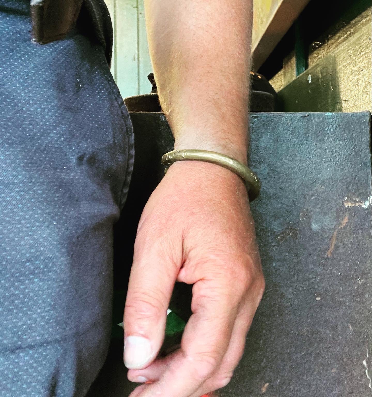 important to note when wearing brass - When brass comes into contact with skin, sometimes a chemical reaction can occur due to the copper content in the alloy. This reaction can be exacerbated by sweat and other factors, resulting in a green discoloration on the skin. The acidity of your skin can also trigger this type of reaction. Simply wash area with warm soapy water and dry thoroughly.