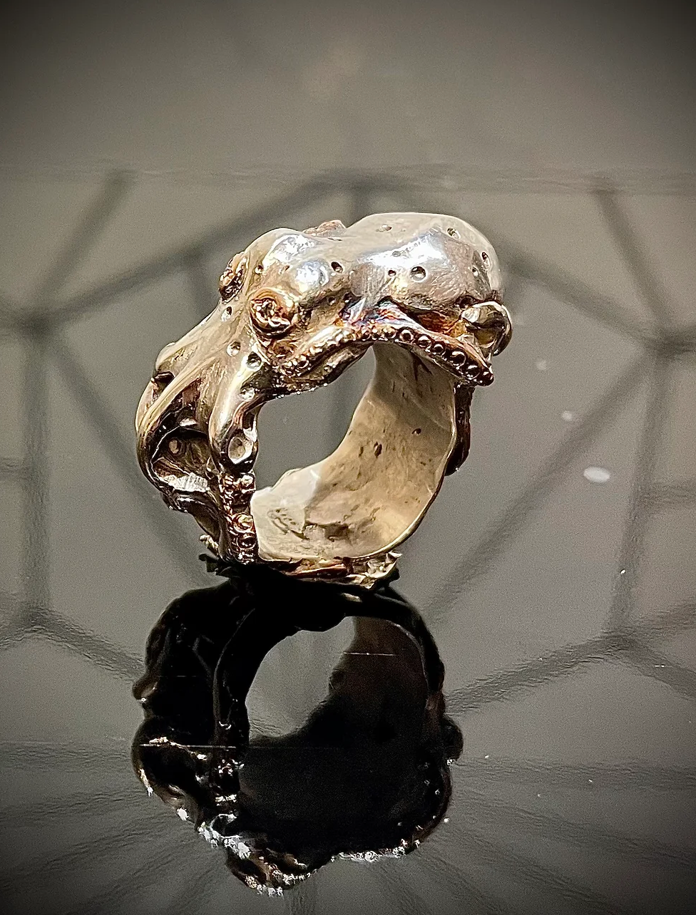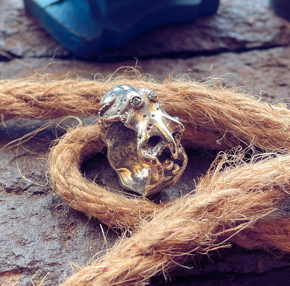 Sterling silver octopus ring set with rough, blue diamonds and finished with rose gold suckers. This piece is a unique original - I never make the same octopus twice.