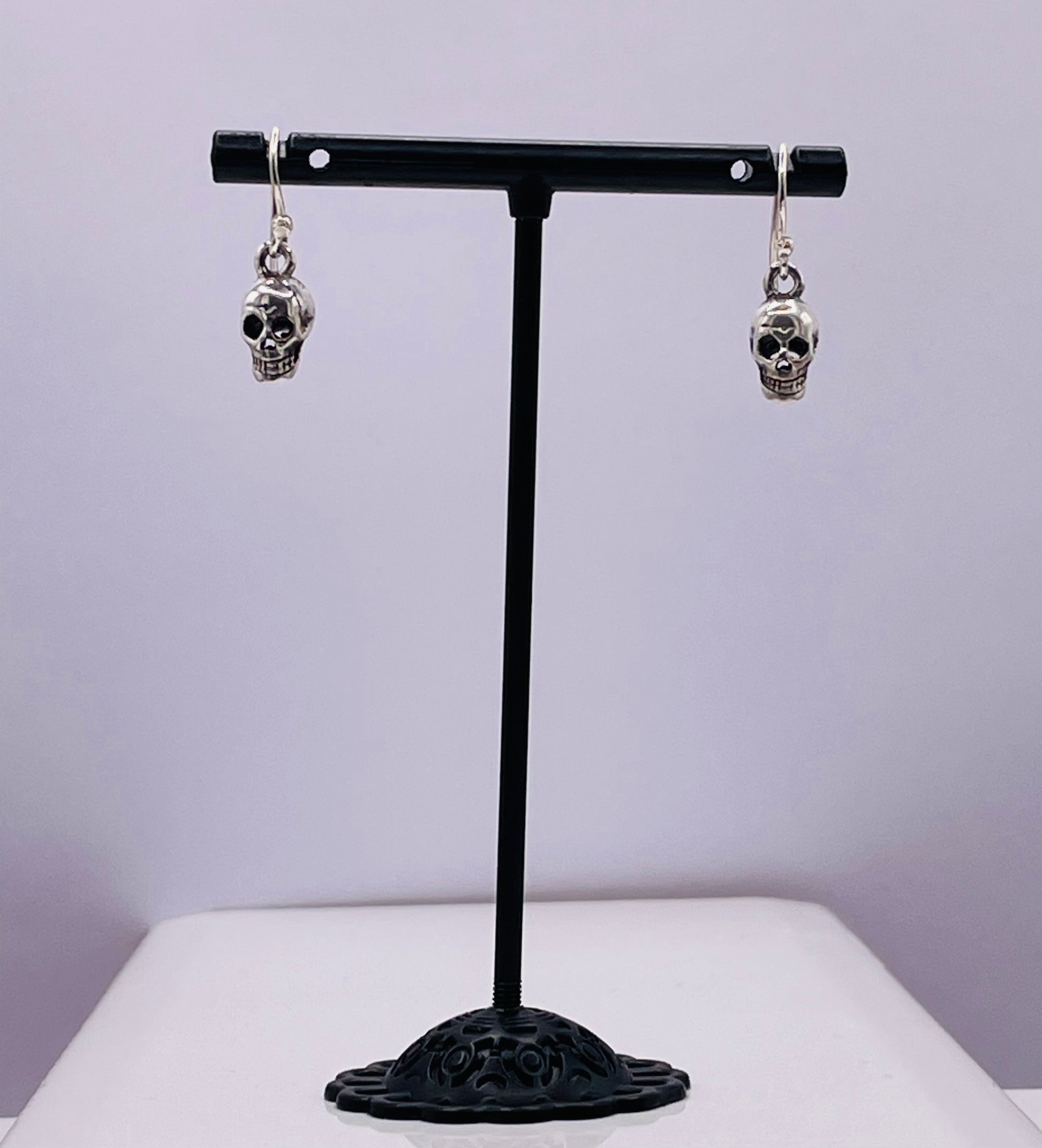 Hand carved, sterling silver skull earrings. Superb detail on these little drop earrings. Handmade in our on-site workshop.